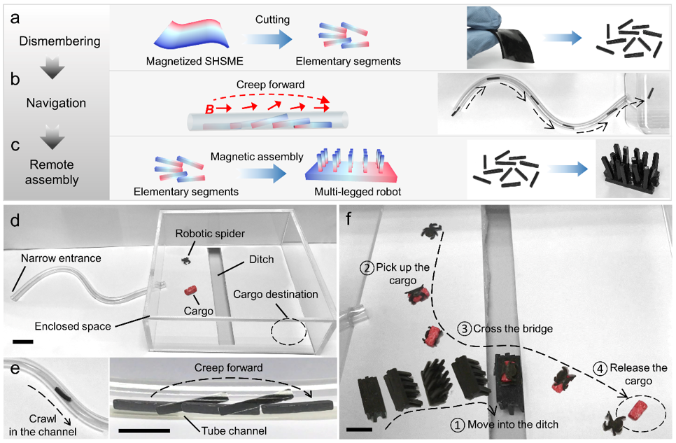 限制性空间的狭窄通道对于软体机器人的部署是个巨大的挑战。研究人员利用SHSME的非接触式远程磁控运动和磁控组装,提出了一种远程操控的“分解-导航-再组装”策略,实现软体机器人的穿越部署与任务完成。在应用实例中,多足机器人“化整为零”后爬行入狭窄通道并完成重新组装,充当桥梁协助水蜘蛛完成搬运任务。