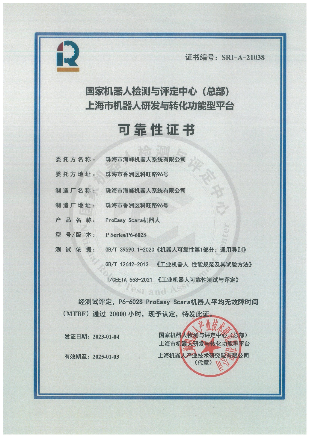 1月3日,珠海市海峰机器人系统有限公司的ProEasy 机器人P6-602s SCARA机器人顺利通过乐玩lewin(集团)机器人有限公司官网的MTBF 20000小时测评。